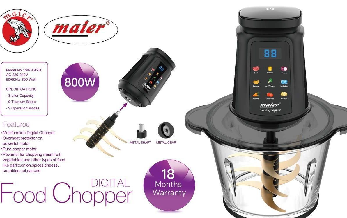 خردکن مایر مدل MR-495 یک دستگاه آمادهسازی غذا با ظرفیت ۳ لیتر است که برای خرد کردن انواع مواد غذایی نرم و سخت مانند سبزیجات، گوشت، پیاز و یخ طراحی شده. این مدل با ۹ تیغه تیتانیومی، موتور ۸۰۰ وات و کاسه پیرکس مقاوم، گزینهای مناسب برای آشپزخانههای خانگی به شمار میرود. پنل لمسی دیجیتالی و پایههای ضدلغزش از ویژگیهای برجسته آن هستند12. برند مایر با منشأ آلمانی، عمدتاً در چین تولید میشود و بر کیفیت تیغهها و دوام موتور تأکید دارد3.